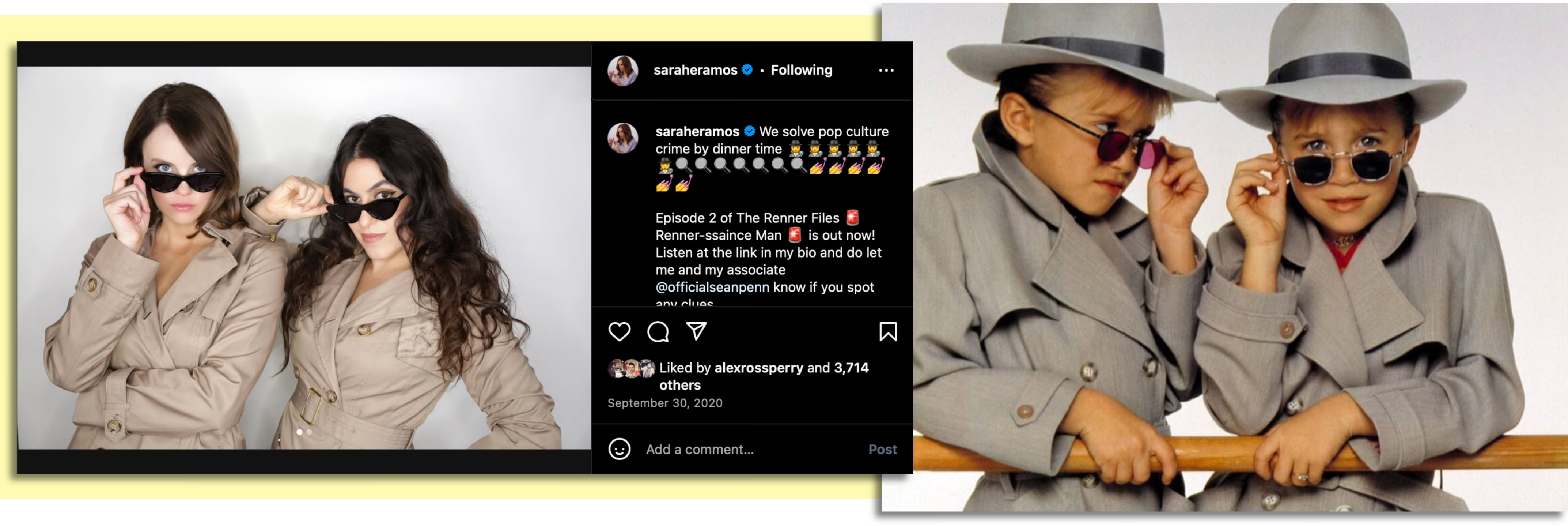 SR: And there was another series called The Adventures of Mary-Kate & Ashley where they played twin detectives and their motto was “We’ll solve any crime by dinnertime.” Caroline [Goldfarb] and I actually used the artwork for that show as our inspiration when we were promoting The Renner Files [their “true crime” podcast about Jeremy Renner’s failed social media app].