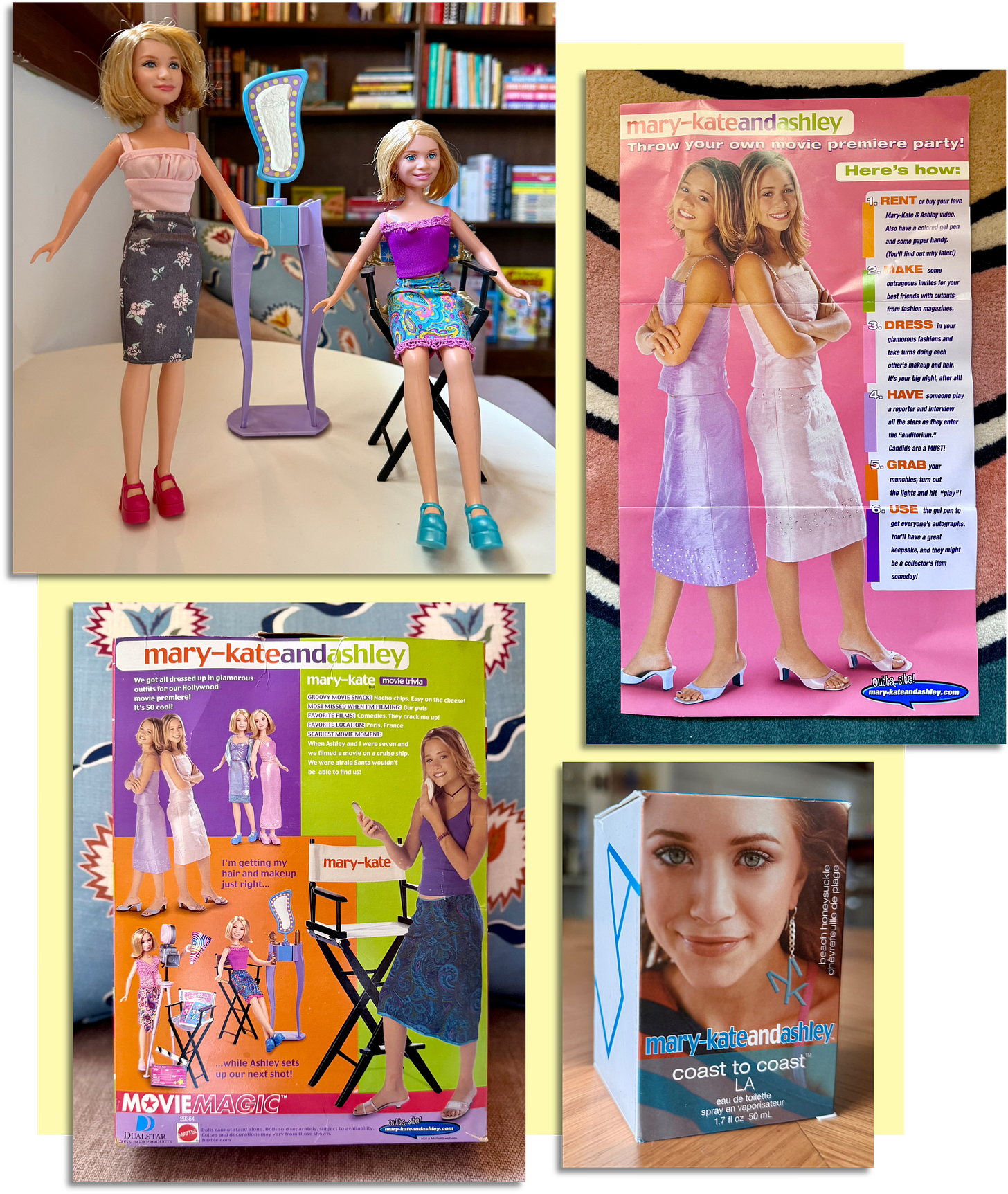 SR: That’s my understanding. Their manager was behind a lot of it. Don’t ask me how I know this, but his name was Robert Thorne, and I think we have him to thank for Dualstar Entertainment [the Olsen twins’ production company] and their unparalleled output of products, such as this Mary-Kate and Ashley Coast to Coast eau de toilette which was sold exclusively at Walmart, and these Mary-Kate and Ashley Movie Magic dolls which let you host your own movie premiere.